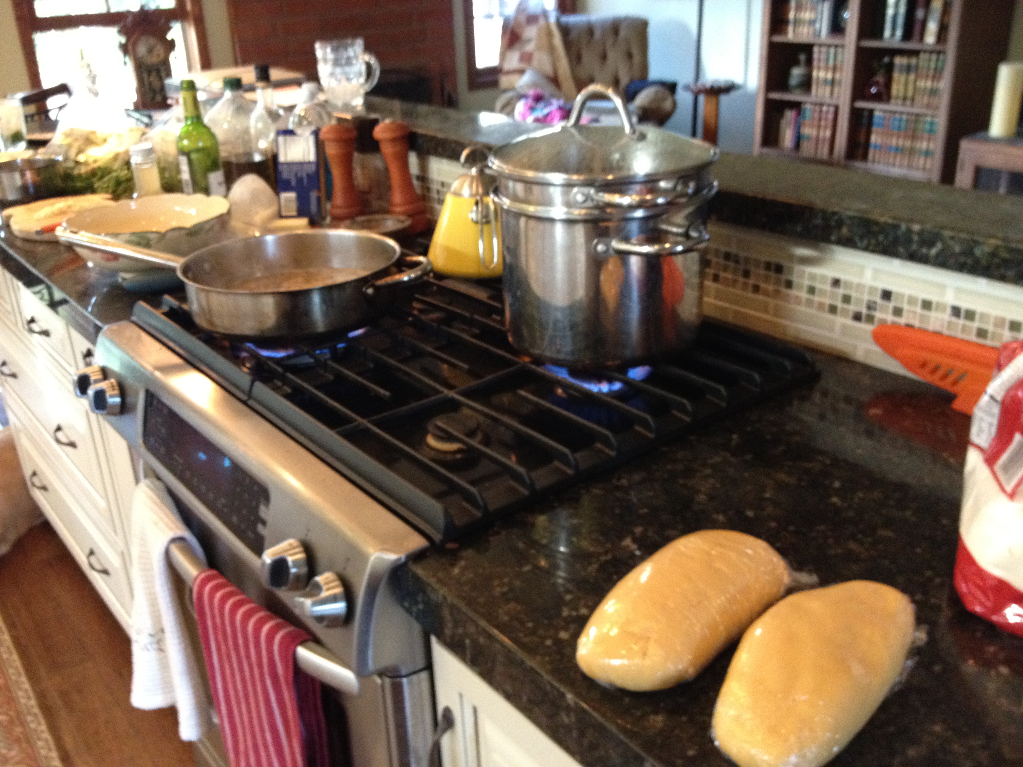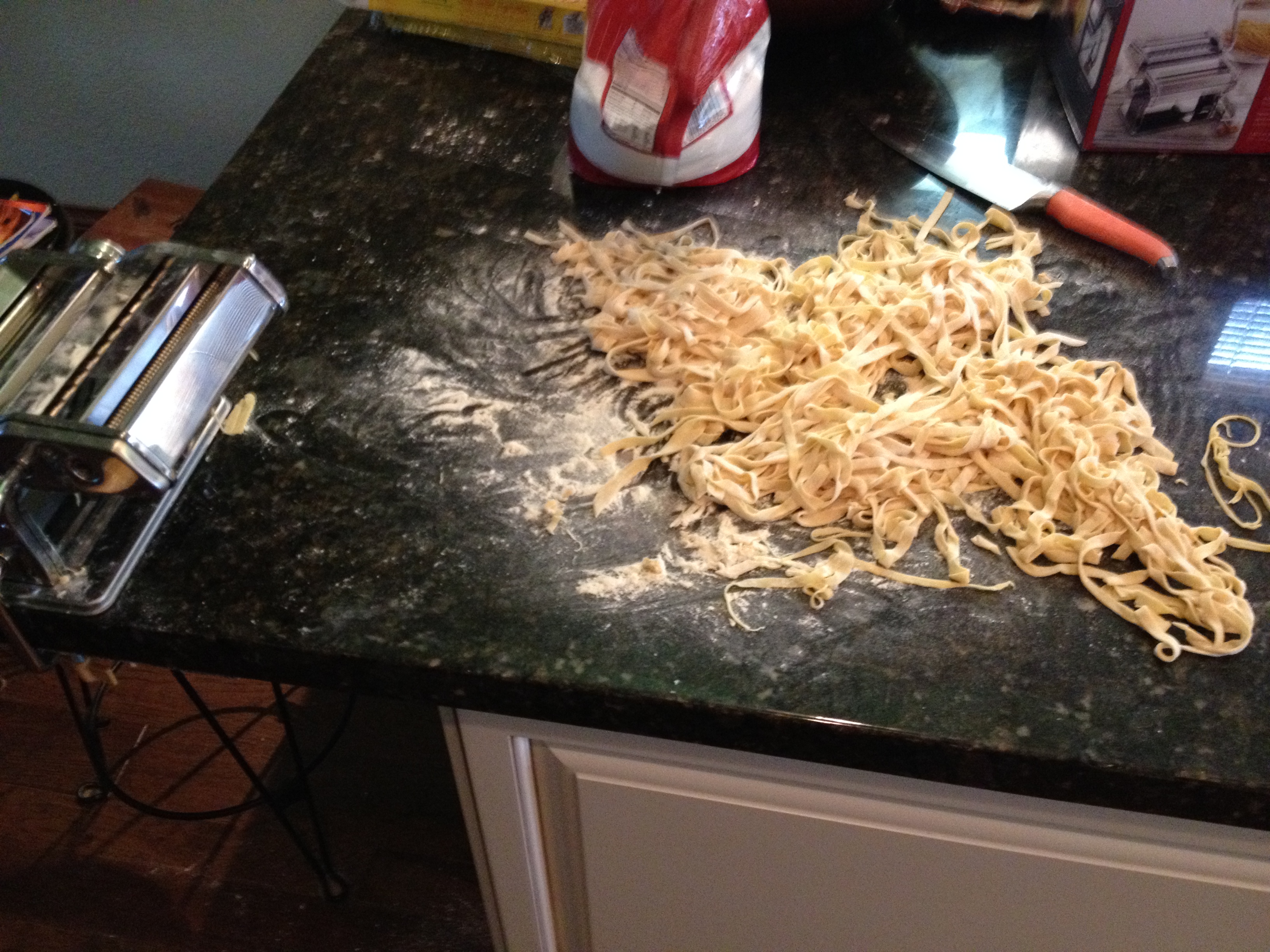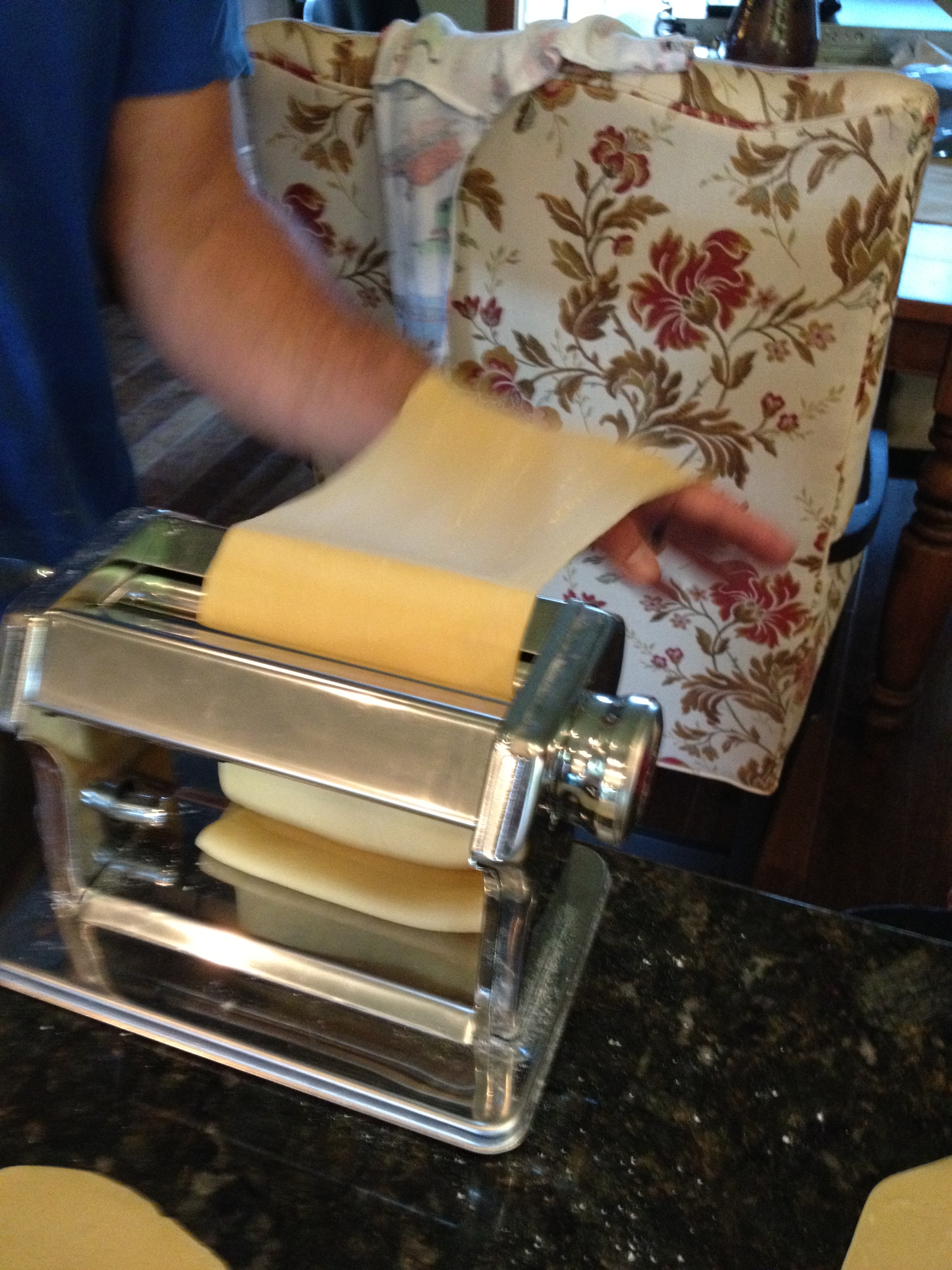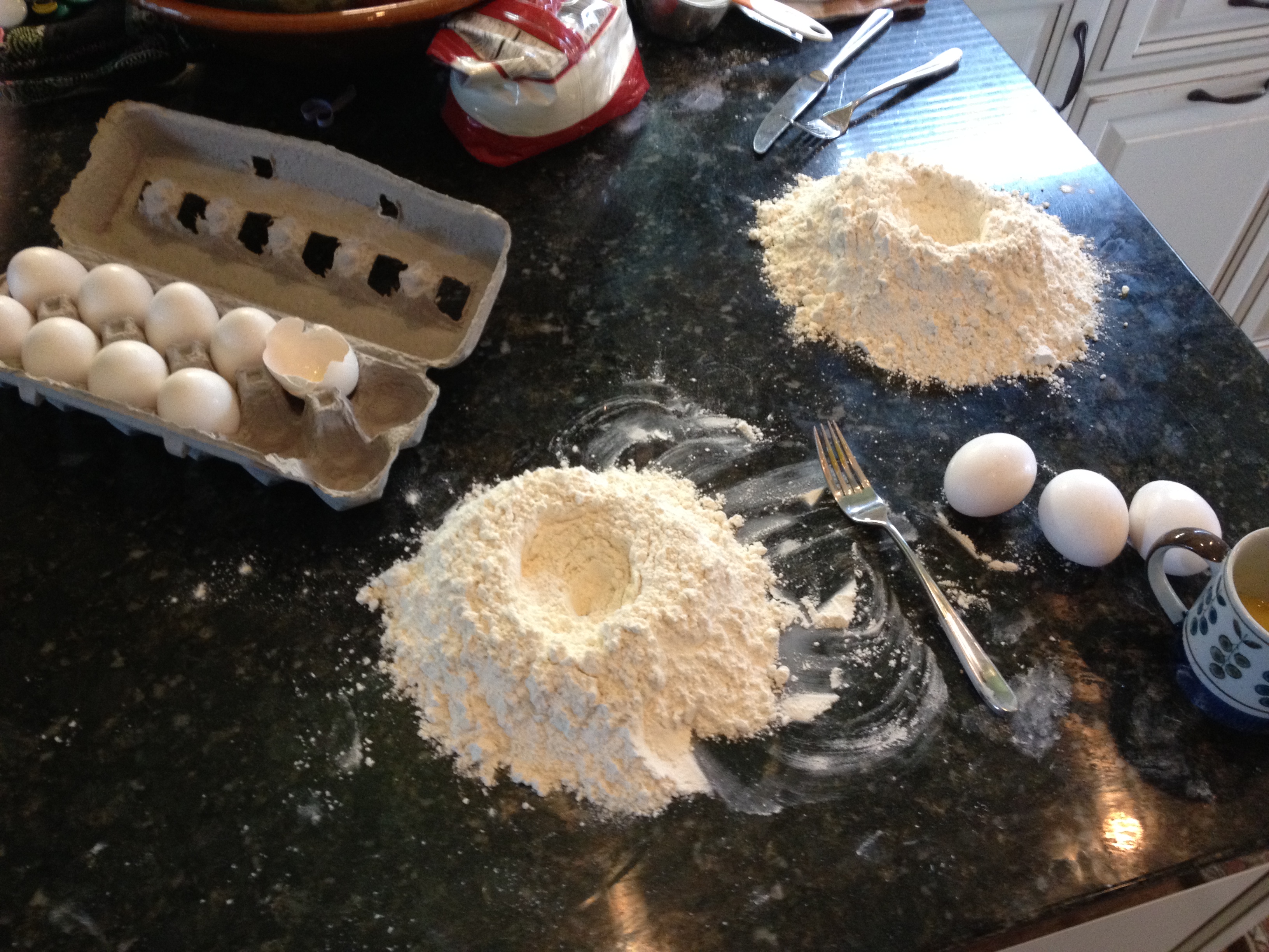 –If the 4 eggs and 3 1/2 cups flour was too dry, add an egg yolk or a tablespoon of olive oil next time. Too wet…add a little more flour. If at any time the dough is sticky when your working with it, add a little flour. If you have a scale, a more appropriate recipe is about 100g flour per large or extra large egg.