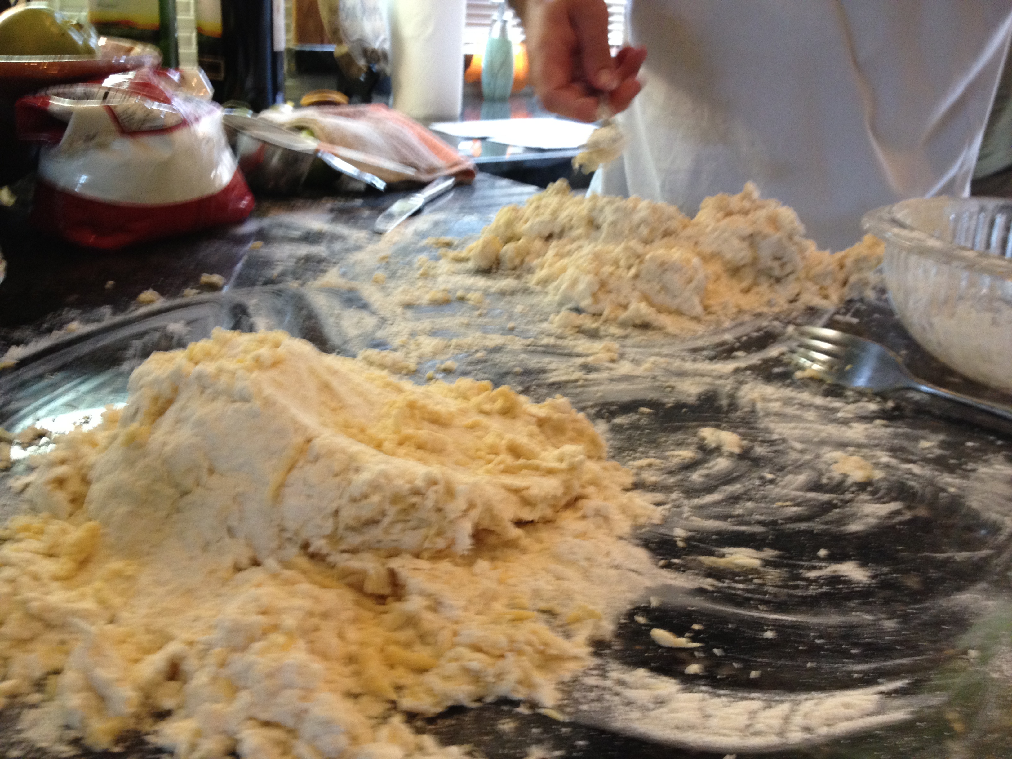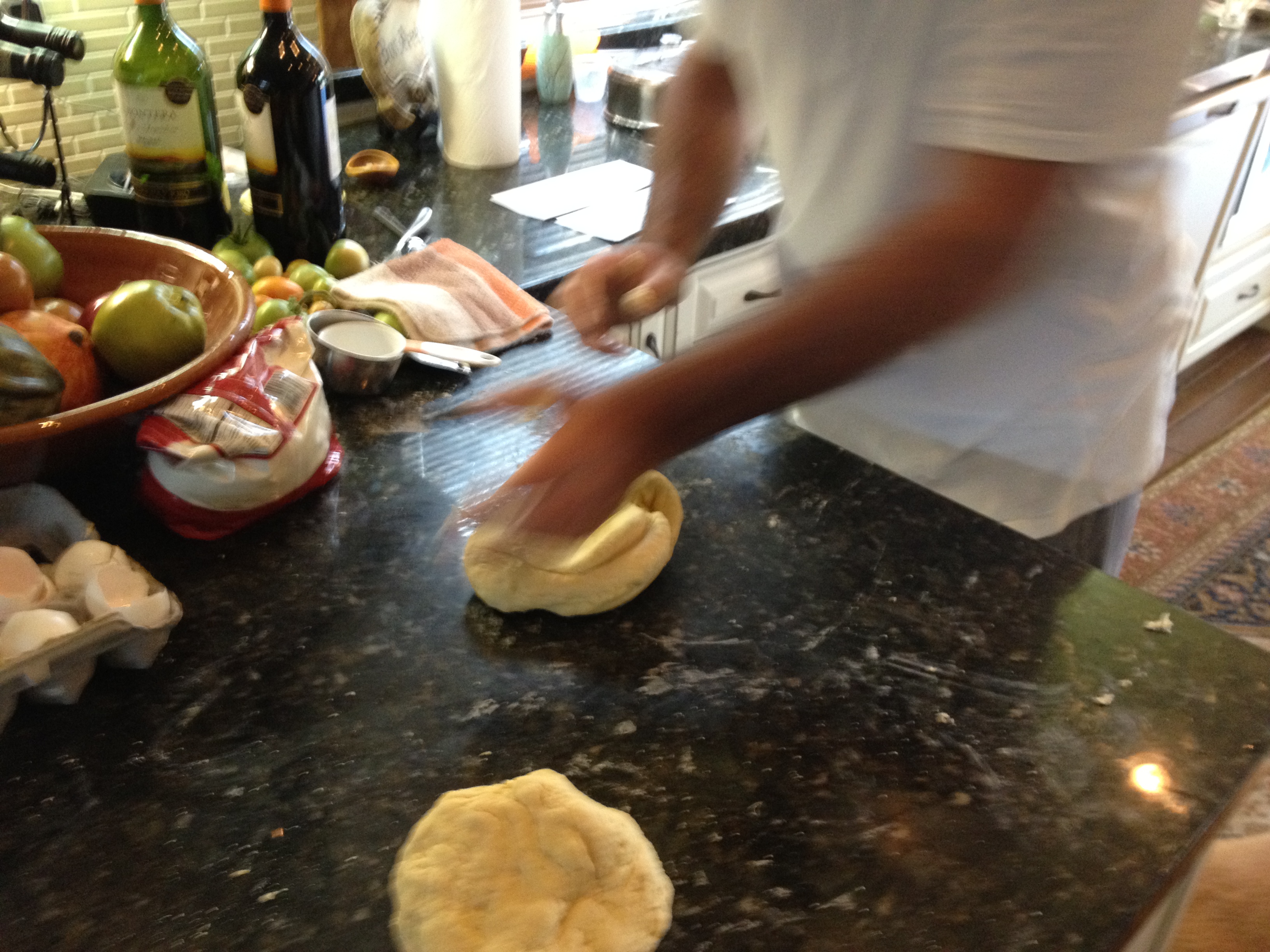 –You can’t really over knead the dough. If you can knead for 10 minutes then great, but you really only knead long enough that the dough is a homogeneous ball that is not sticky, tough or crumbly. Knead by pulling the dough toward you and over itself; then push it away and into itself with the heel of your hand. Use your body weight not your arms. After you are done or bored, wrap it tight in plastic and let is rest for 30 minutes to an hour before rolling.