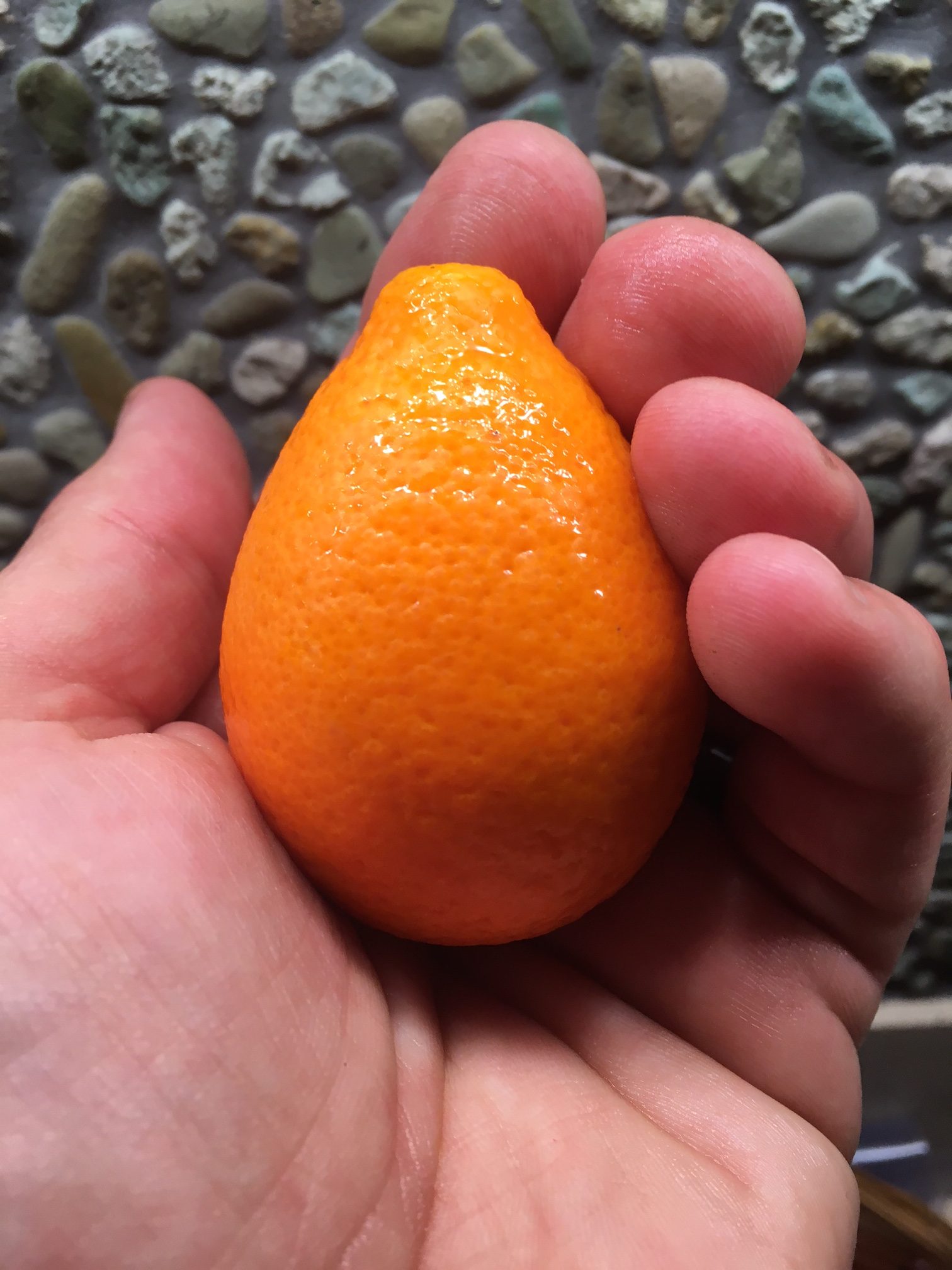 Not a kumquat, no. Larger and sweeter, the Mandarinquat is a lovely little fruit gem that can be utilized many different ways. As you can see, just in hand as a raw snack is easy, novel and tasty.
